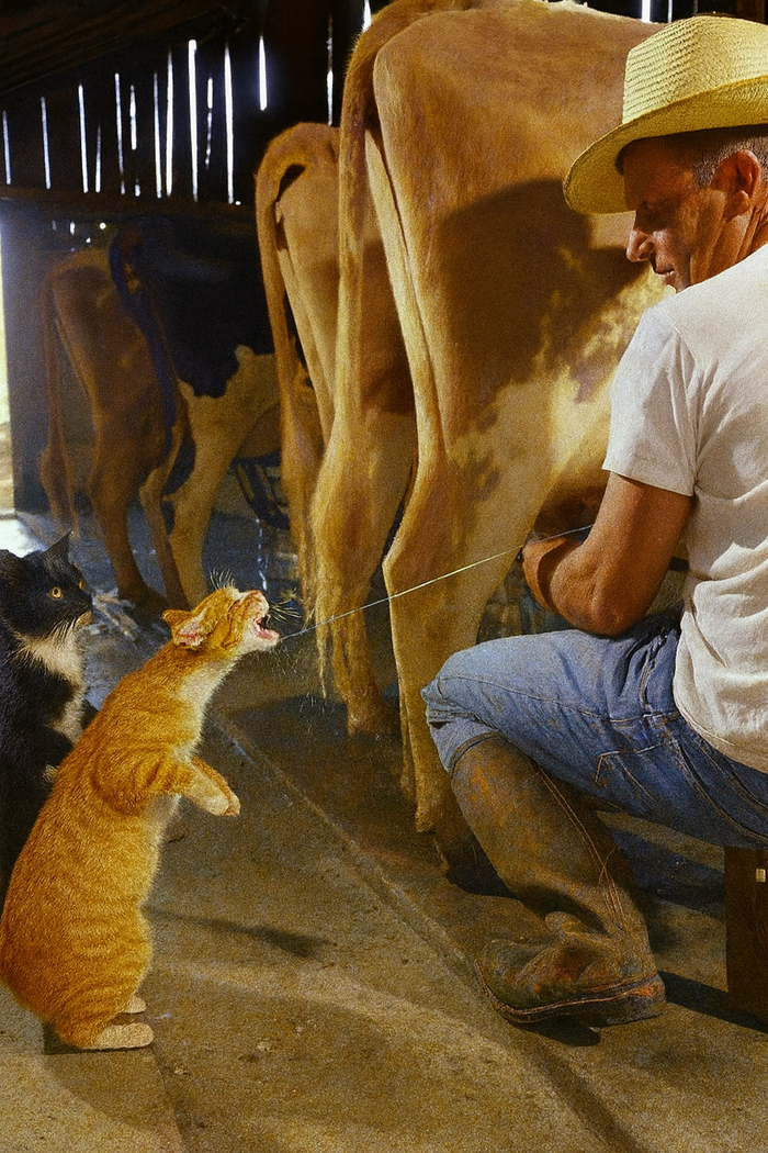 Кошки встают на задние лапы, чтобы поймать струю молока во время доения на молочной ферме Арча Бадершера, 1954 год.