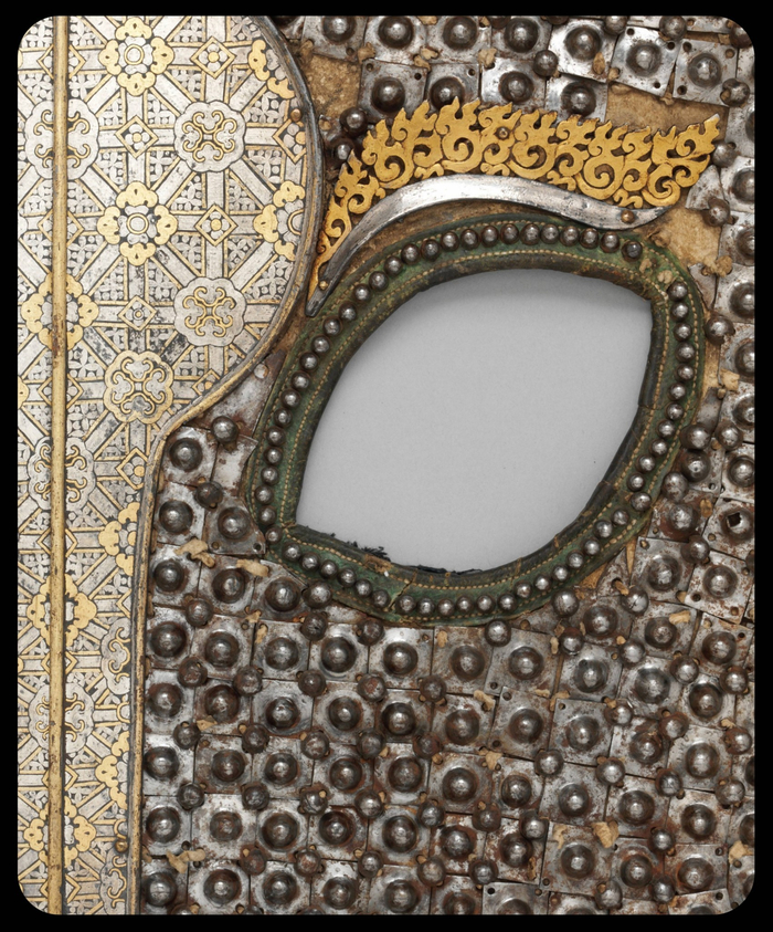 Этот тип доспехов известен как шаффрон, шафран (или шамфрон), и он должен был закрывать морду лошади от лба до кончика носа. Именно этот изготавлен путем пришивания небольших железных пластин, золотых и серебряных элементов и меди к кожаной/хлопковой основе.