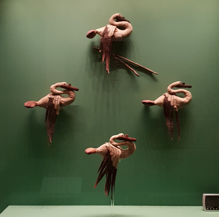 Этот поразительный артефакт нашли при раскопках в Пятом Пазырыкском кургане в 1949 году. Археологи группы Сергея Ивановича Руденко обнаружили у древней племенной могилы четыре 30-сантиметровые фигурки птиц. Лебеди сотканы из натурального белого и окрашенного черного войлока и набиты оленьей шерстью. Фигурки получили название Пазырыкские лебеди. Они принадлежат к культуре алтайских скифов — степных кочевников железного века. Войлочные птицы сохранились благодаря вечной мерзлоте. Сибирский климат и глубина их находки (каменная насыпь имела глубину в 4 метра) позволили им дойти до наших дней в первозданном виде. Только вот игрушками эти лебеди не были. Птицы, вероятно, были закреплены на верхних жердях погребальной повозки, принадлежавшей верховной жрице или жене вождя племени. Мумия женщины также сохранилась в кургане: на ее статус указывают руки, покрытые сюжетными татуировками. Лебедей четыре — как и упряжных коней у повозки, что говорит о ритуальном характере фигурок. Археологи отмечают, что определение этих птиц как лебедей весьма условно. Их черные крылья напоминают скорее оперение журавлей, но журавли в Пазырыкской культуре попросту не представлены. Из крупных птиц Алтая у скифов часто встречаются изображения грифов-стервятников. В то же время, крылья могли быть окрашены в несвойственный лебедям черный, чтобы подчеркнуть их участие в переходе усопшей в загробный мир. Сейчас Пазырыкские лебеди хранятся в Эрмитаже.