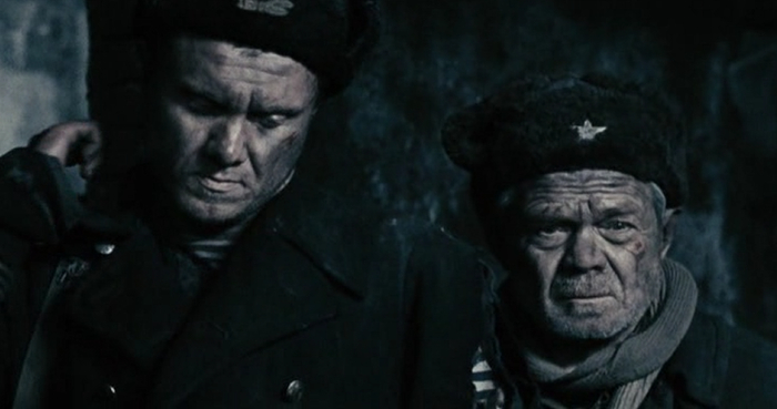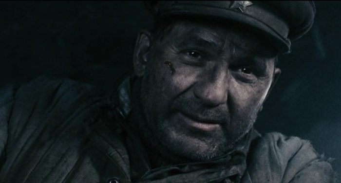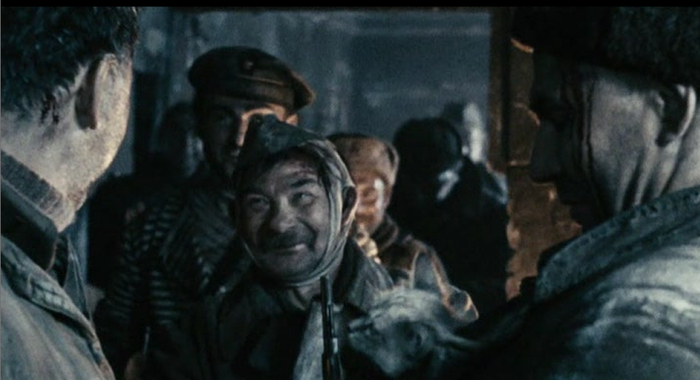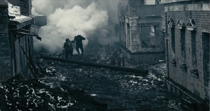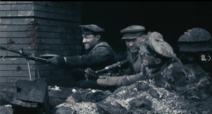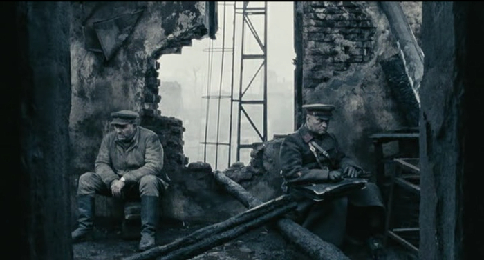Нам же показывают, как двое советских солдат под бомбёжкой, бегут к заводу Красный Октябрь. Разрыв снаряда, старый солдат падает в воронку, а там испуганный немец лежит, которому старый солдат случайно протягивает руку, думая что там свой лежит. Вот так и лежат в воронке держась за руки советский и немецкий солдат, после чего разбегаются в разные стороны.