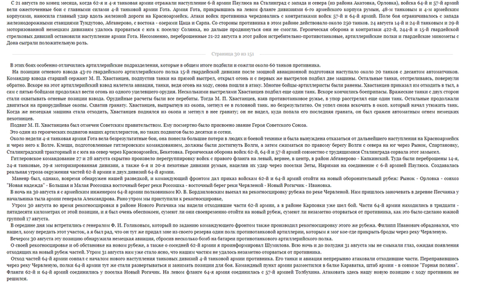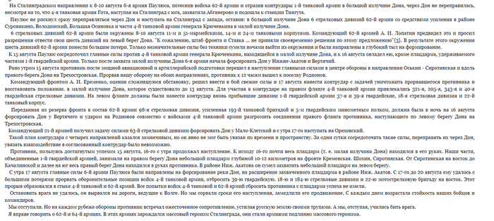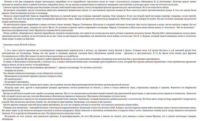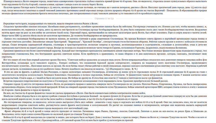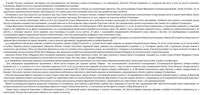 Майор Березкин совсем плох, лежит на кровати и ни кого не реагирует, чтобы хоть как то расшевелить командира, полковой комиссар вслух зачитывает ему письмо из дома. Нам же показывают разных советский солдат, закадровые голоса перебивая друг-друга, зачитывают отрывки из писем. Так нам опять крупных сражений подл Сталинградом не показывают, приведу несколько выдержек из воспоминаний Василия Ивановича Чуйкова.