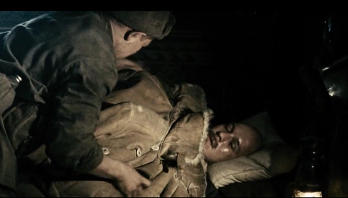Толя просит, что бы комиссар позвал медицинскую сестру. Комиссар сестру вызывает, та поит беспомощного Анатолия водой. Нас же опять переносят к майору Березкину, который выбирается из под горы наваленных на него шинелей с тулупами и ему вроде как даже получше. Вон оно что оказывается кипяток животворящий делает.