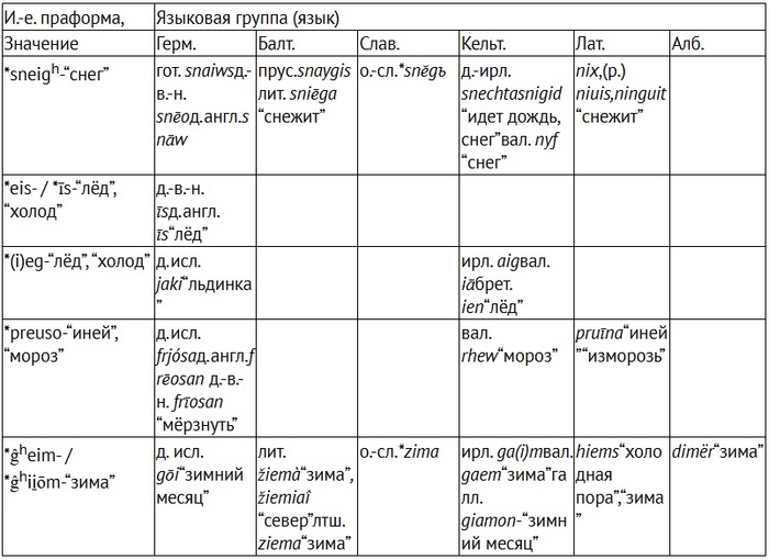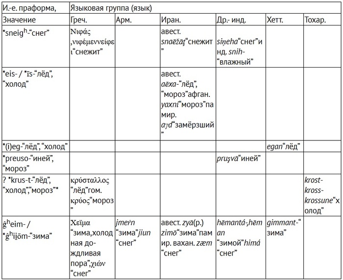 Названия снега, мороза, зимы в и.-е. языках (Гамкрелидзе, Иванов, Индоевропейский язык и индоевропейцы)