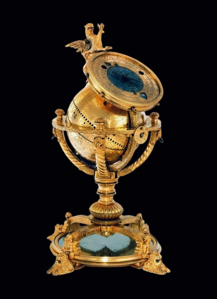 2. Небесный глобус эпохи Возрождения, около 1584 года. Считается одним из самых ранних механических воплощений системы Вселенной. Небесный глобус вращается вместе с моделями Солнца и Луны, которые перемещаются вдоль эклиптики, показывая их положение.