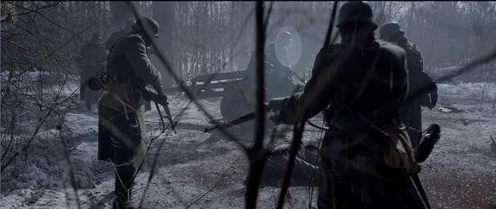 Похоже слова" Можем повторить" ,российские режиссёры воспринимают прямо таки буквально, запихивая похожие эпизоды из фильма в фильм. Как и в фильме "Т-34" ,немцы опять заходят с тыла, но так как к грузовику нашего героя прицеплена не полевая кухня, а артиллерийское орудие, то Шухов решает прямо тут принять бой против немецких танков, а не устраивать "Форсаж" уворачиваясь на полуторке от немецких снарядов.