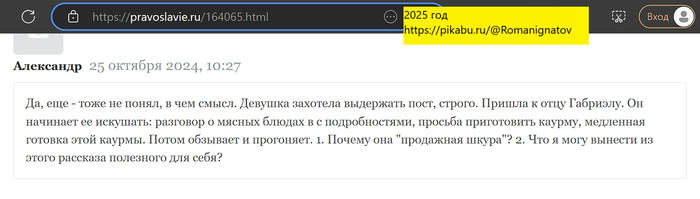 Александр: Да, еще - тоже не понял, в чем смысл. Девушка захотела выдержать пост, строго. Пришла к отцу Габриэлу. Он начинает ее искушать: разговор о мясных блюдах в с подробностями, просьба приготовить каурму, медленная готовка этой каурмы. Потом обзывает и прогоняет. 1. Почему она "продажная шкура"? 2. Что я могу вынести из этого рассказа полезного для себя?