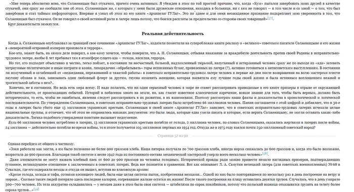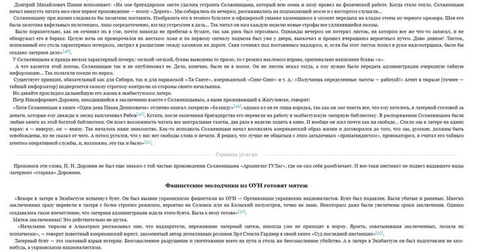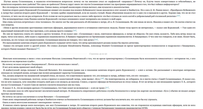 «Хотя Солженицын в книге «Один день Ивана Денисовича» отлично описал лагерную «баланду», однако ел он ее лишь изредка, так как он мог поесть все, что ему хотелось, в лагерной столовой за деньги, которые ему дважды в месяц выплачивал Рябов. Кстати, после окончания бригадирства его перевели на работу в экибастузскую лагерную библиотеку. В распоряжении Солженицына были любые книги из этой богатой библиотеки. Он имел возможность читать все центральные газеты, два раза в неделю ходить в кино.