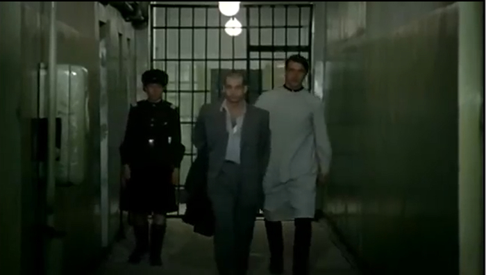 В камеру к Певцову заходит надзиратель и спрашивает, почему Певцов до сих пор как идиот, сидит голый. Надзиратель выходит, Певцов неспешно одевается, надзиратель наблюдает за ним в глазок. После того как Певцов оделся, надзиратель зловеще цокая ртом, нашего так сказать "героя" ведет в камеру .