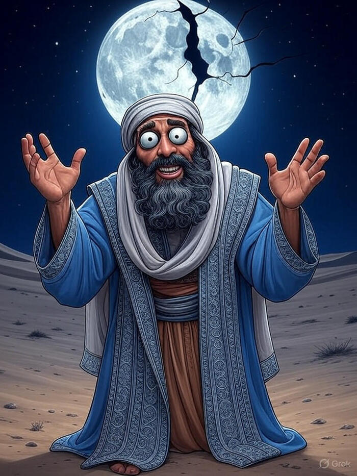 «Приблизился Час, и раскололась Луна». Многобожники потребовали от пророка Мухаммеда знамение, и он им показал. Луна разделилась на две части, одна из которых осталась над горой, а другая - над другой горой. Это событие, как знамение, подтверждает близость Судного дня и силу Аллаха. Нет ни одного научного свидетельства о глобальном расколе Луны. Даже малейшая трещина вызвала бы катастрофические эффекты. Нет подтверждений у китайцев, индийцев, греков — никто в мире этого не заметил.