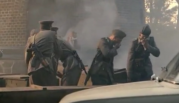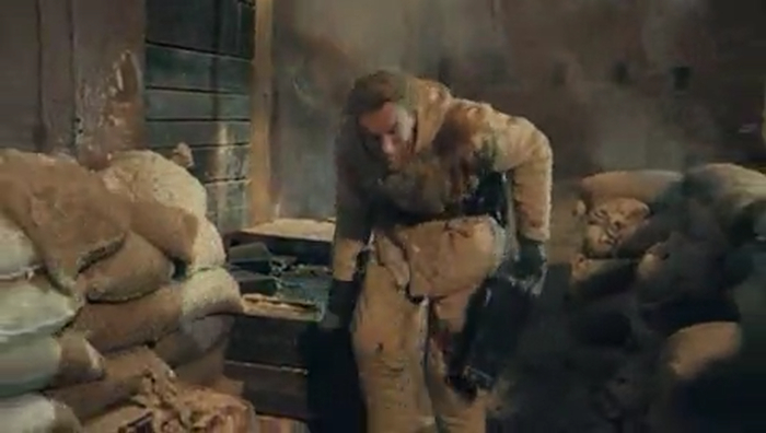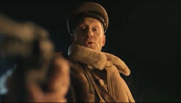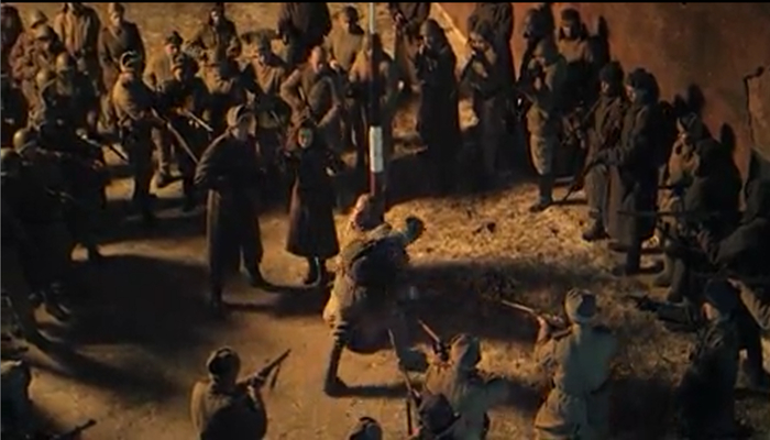 Пока Эльза ищет ключи от наручников, на базе появляются русские, которые вламываются на базу, на американском танке M3 (спасибо, что не на Абрамсе). Поскольку всех немцев в одиночку убил Клосс, русские бегут вперед веселой шумной толпой, на ходу стреляя из автоматов. До кучи, впереди всех бежит то ли казах, то ли чучка, в потемках не разберешь.