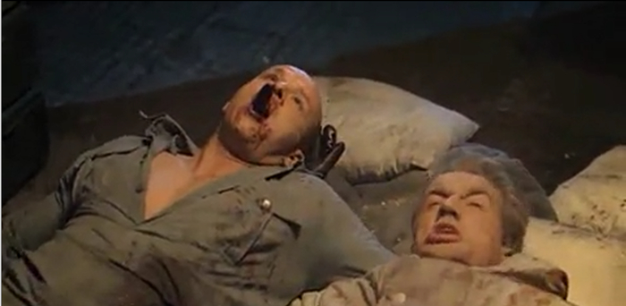 После нескольких забегов по кругу, один из нацистов кидает в Клосса гранату, (ну молодец, тут же взрывчатки полно, плюс еще керосин в лампах). Затем, одноглазый, стреляет в лысого, думая что пред ним Клосс, после чего Ганс стреляет в одноглазого. Потом загорается керосин, огонь перекидывается на ящики со взрывчаткой, Ганс убегает, все начинает взрываться.