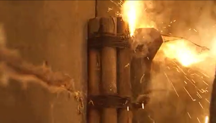 Динамит загорается, через некоторое время, маяк со всем содержимым взлетает на воздух. Взрывная волна раскидывает по окрестностям, машины, ящики, поляков и агентов ШТАЗИ. Затем очкарик говорит Гансу, что речь не о комнате, надо было достать Бормана и других, плешивый пинает труп лысого нациста.