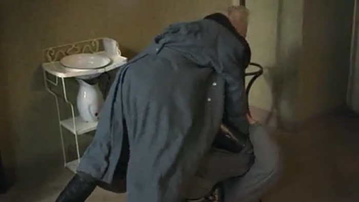 Тем временем, Ганс заходит на незапертый склад, передергивает затвор пистолета, а не то о чем вы подумали, хватает вместо глушителя подушку, уже собирается прикончить охранника. Но вот незадача, охранник материализуется за спиной Ганса, молотком выбивает у него пистолет, наш герой вступает с ним в рукопашную схватку. Покувыркавшись на полу и пошвыряв друг друга, Ганс всё-таки убивает матросика, черенком молотка.