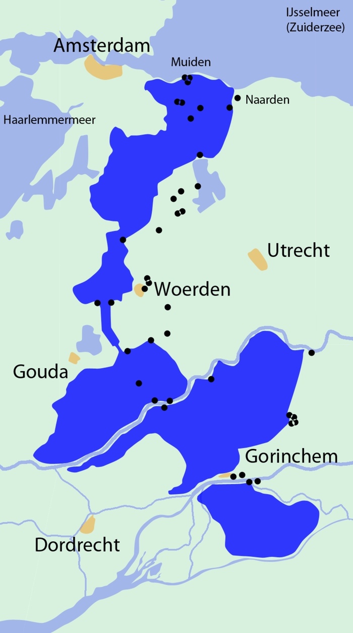 Схема старой конфигурации Ватерлинии. В дальнейшем линия сильно достраивалась и перестраивалась до середины ХХ века. В финальной своей конфигурации она была призвана сдерживать бросок советских танков к Ла-Маншу, но для планов Леопольда и старая версия была непреодолимой преградой.