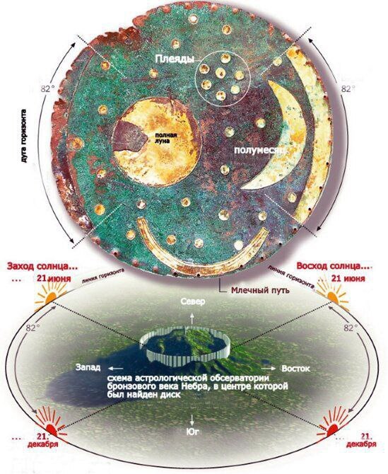 Бронзовый «Небесный диск Небры» с золотыми изображениями Солнца, Луны и 32 звезд считается старейшим из известных рисунков космоса.