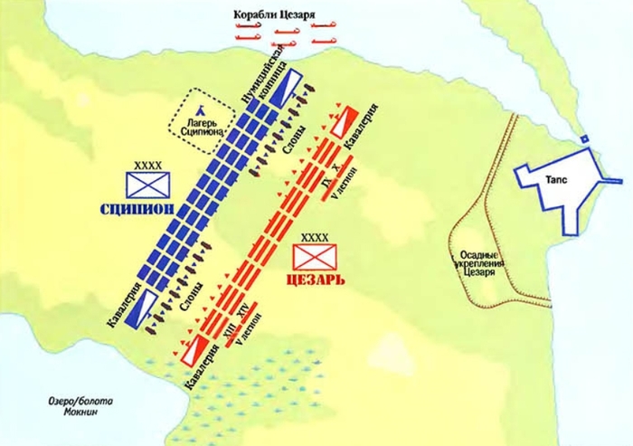 Тем не менее вопросы управления, хоть и важные, были на тот момент второстепенными. Требовалось как можно быстрее расправиться с армией оптиматов в Африке. Хотя войска из Греции эвакуировались под командованием Катона, в Африке он вынужден был передать командование Метеллу Сципиону, как более опытному военачальнику, а что самое главное – человеку имевшему немалые связи в регионе. На вторых ролях вынужден был действовать и Лабиен. Всего у оптиматов было до двенадцати легионов и большое число легкой конницы, предоставленной нумидийцами. Однако выставлять в поле все эти силы они не могли, так как в провинции было слишком много симпатизантов Цезаря и требовалось держать в городах большие гарнизоны. И дело было не только в том, что местные элиты не хотели прихода ужасов войны, но и в большом количестве ветеранов Мария, которые получили тут наделы. И для них Цезарь был наследником дела своего великого родственника, а оптиматы – наследниками его главного врага Суллы.