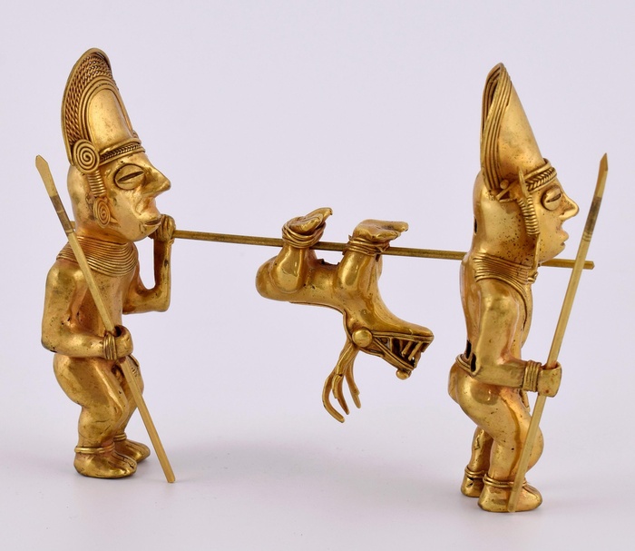 Золотая статуэтка двух охотников и животного на шесте. Колумбия, 300–1600 гг. н. э.