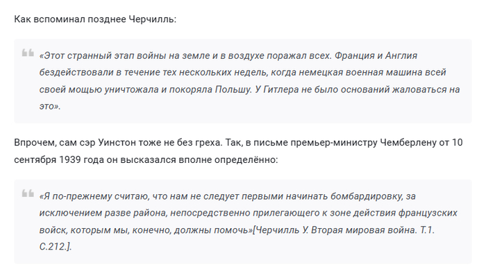 «По возвращении на фронт я был удивлён царившей там тишиной. Артиллеристы, расположившиеся у Рейна, смотрели, сложа руки, на немецкие колонны с военным снаряжением, передвигавшиеся на другом берегу реки, наши лётчики пролетали над огнедышащими печами заводов Саара, не сбрасывая бомб. Очевидно, главной заботой высшего командования было не провоцировать противника»