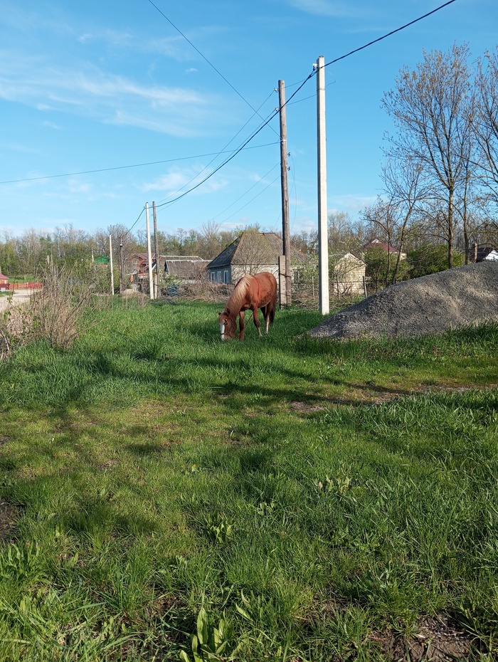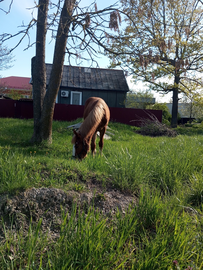 Кобыла сначала спокойно ела траву, потом, когда меня уже было не видно за деревьями, стала выглядывать, ну а после двинулась медленно и нехотя за мной в сторону дома...