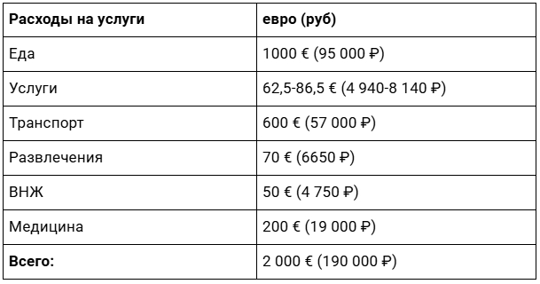 Для нашего подсчета возьмем € 150 в неделю или, округлив вверх, €700 в месяц. По-хорошему нужно брать 1000. У нас меньше 1000 не выходит, но мы и не экономим на еде.