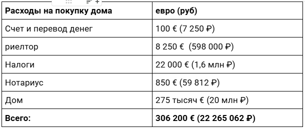 В 2019 году, когда я покупал дом, один € стоил 72,5 ₽. По этому курсу и буду считать.