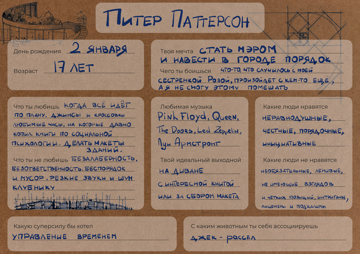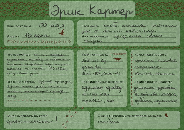 Также наша дизайнер постаралась передать разные почерки и характер персонажей через оформление страничек. Их цвет тоже не случаен, у каждого из героев будет свой отличительный, чтобы было проще их запоминать.