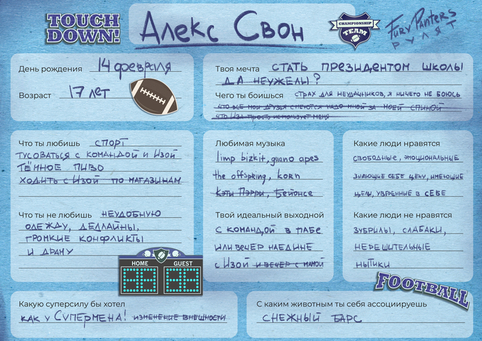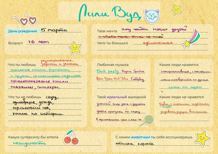 Для каждого персонажа новеллы заполнены анкеты, какие были в детстве у многих - анкеты для друзей) в них сильнее раскрываются любимые вещи и страхи, нам показалось, что это отличная идея, чтобы узнать персонажей поближе.