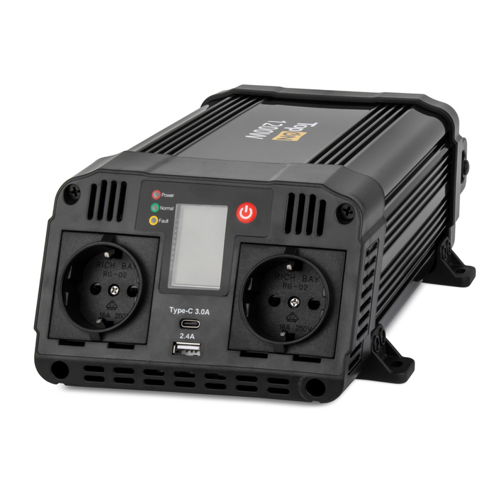 Автомобильный инвертор TopON TOP-PI1202 предназначен для преобразования напряжения бортовой сети автомобиля в полноценные розетки 220 В. Номинальная мощность 1200 Вт и пиковая до 2400 Вт позволяют подключать ноутбуки, электроинструменты и другую технику в дороге. Наличие двух розеток, USB-портов и Type-C делает устройство универсальным для разных сценариев.