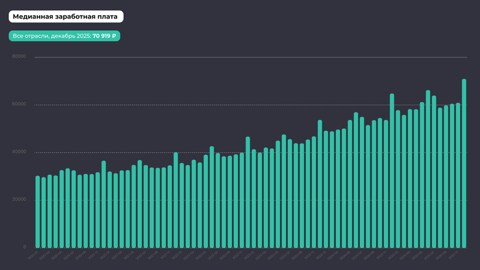 По данным СберИндекса, медианная зарплата в декабре 2025 г. составила 70 919 рублей в месяц.