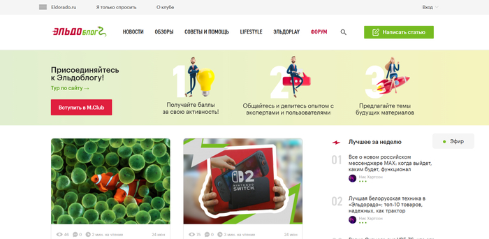 Этот сервис тематически очень похож на блог от М.Видео (что неудивительно, так как это компании одной группы). Здесь также ждут обзоры бытовой и цифровой техники, электроники, гаджетов из ассортимента Эльдорадо, а также инструкции и полезные советы для покупателей. Предложить материал вы можете, нажав на кнопку "Написать статью" в правом верхнем углу.