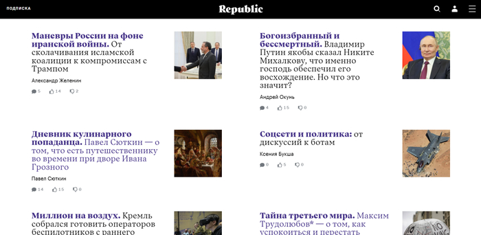 Это известное независимое издание с широкой и разнообразной тематикой. Особой популярностью здесь пользуются статьи про политику, геополитику, экономику, бизнес, технологии, общество и культуру. Начинающим журналистам стоит обратить внимание на возможность публикации партнерских материалов. Тщательно изучите раздел "Партнерство" по ссылке, чтобы понять требования. Будьте готовы предложить сильную, актуальную тему или экспертное мнение.