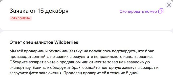 Подаю на оспаривание этого отказа. Через 5 дней техподдержка WB отказывает.
