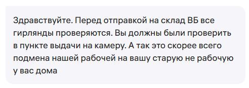 Прилетает отказ. Мотив: «Недостаточно информации о браке». А в личке продавец и вовсе опускается до обвинений: мол, я подменила новую гирлянду на свою старую сломаную и пытаюсь её вернуть.