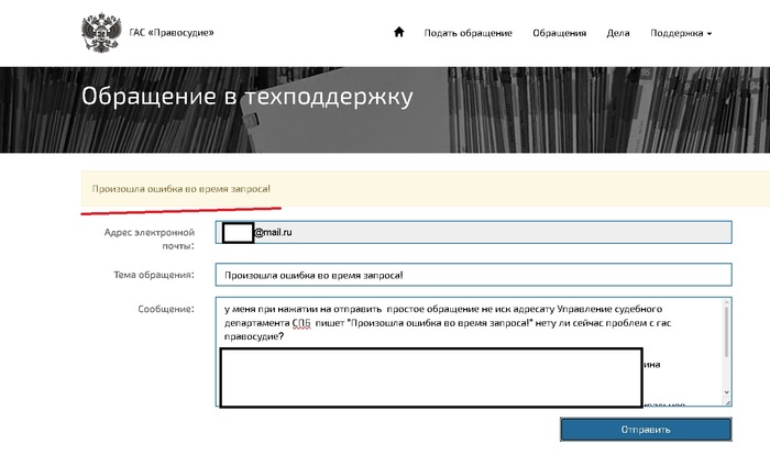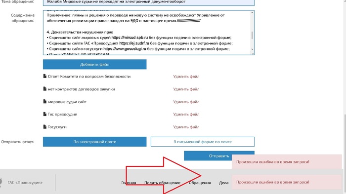 Когда я писал полдня жалобу и каждый файл прикладывал по отдельности и вводил имя и тут у меня на ГАС "Правосудие" при нажатии на "отправить", простое обращение не иск, адресату Управление судебного департамента СПБ пишет "Произошла ошибка во время запроса!" так же пишет при попытке отправить в техподдержку ГИС ЖКХ.