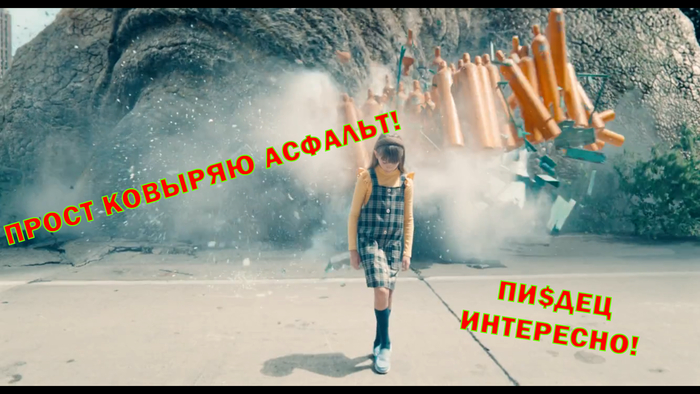 Но самые тупые, конечно, простые люди. Просто жесть! То суперлюди сражаются, то огромный монстр бесогонит, а они тупо стоят и смотрят в окна, под ногами суетятся, даже работу не бросают. Мужик с мороженым, стоя перед окном, вообще, похоже, только заметил, что на улице замес идет. Сцена с девочкой - это просто апофеоз идиотизма. Ходит гигантский монстр, с ним сражаются четыре супергероя, а она... стоит к этому действу спиной и просто ковыряет туфлей асфальт! Буквально! Пиздец, идите нахуй! Ганн просто сказал девочке: вот, стой здесь. Что тебе делать? Да хуй знает, сама придумай, мне впадлу придумывать тебе нормальное действие. Это буквально худшая сцена в фильме. Даже спасение белки логичней.