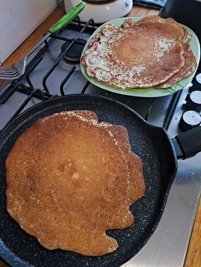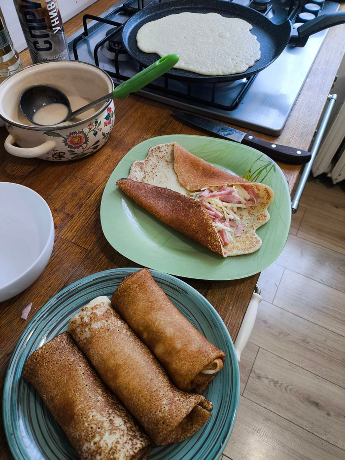 Всем приветы, всем приветы! Всегда делал заварные блины. Ну вот это вот когда стакан муки разводишь в стакане молока до "без комочков", а потом вваливаешь туда стакан кипятка, месишь и докидываешь яичко или два. Вчера на канале Алесандра Селезнева вышел новый шортс с НЕ заварными блинами по случаю масленицы и я решил изменить своим традициям.))