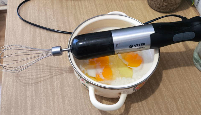 Массу зафигачил в остатки молока и разбил в это всё 3 яйца. Достал Витька и пробил всё до однородности, около 3-х минут заняло. И пошел за компик, дабы глютен в очередной раз сотворил свою магию.