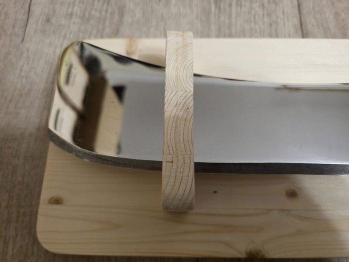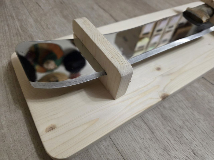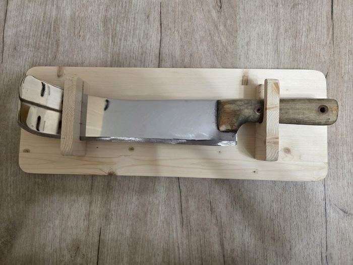 Экземпляр 1950-х годов. Толщина клинка - около 5мм! Рукоять выполнена из берёзы — не скользит в руке, в отличие от пластиковых аналогов, и при контакте с продуктами не придаёт им постороннего вкуса или запаха.