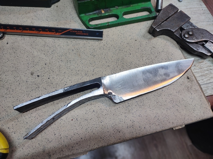 Придал форму, насверлил отверстий, воткнул гвозди изнутри, шляпки внутри рукоятки, припаял на спинку медную полосу, задняя часть паяная твердым поипоем из двух деталей- плоский назовем его тыльником и внутри деталь для фиксации пружины.
