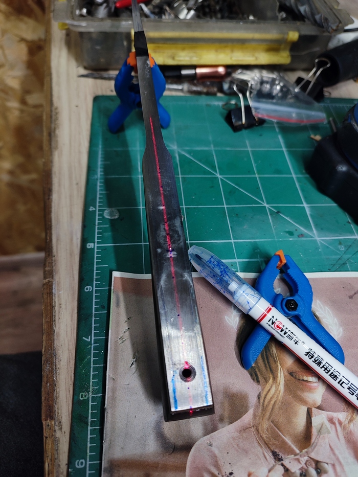 Изначально думал накладки с рога лося сделать, но лень было ехать до матушки с гаража забирать, принял решение выпилить спину с родной рукоятки. Получилось 2 накладки отдельно не фотографировал. Решение крепить на заклепки из гвоздиков