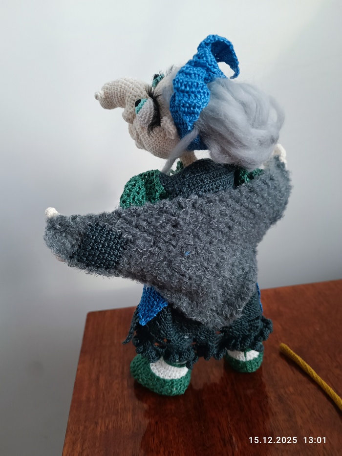 Дамочка связана преимущественно из хлопковой пряжи, исключение - платок, прутья метлы и котик. Волосы ещё из шерсти. Реснички накладные (ну а как без них?). Может стоять. Руки, ноги и голова подвижные благодаря проволочному каркасу. А ещё одежда у неё многослойная, ведь продумал автор мастер-класса всё: начиная от нижнего белья, до платка и фартука. С заплатками.