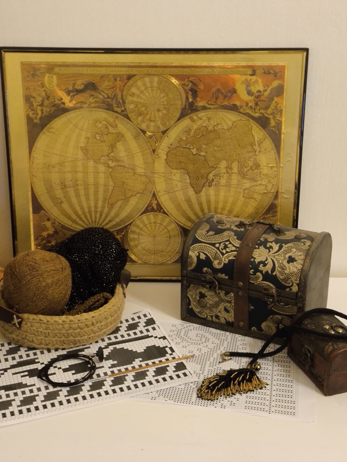 Шерстяная тонкая золотистая пряжа с люрексом в бобинах, ещё советских времён, подруга мне все свои запасы отдала. И один моток чёрного цвета "Голд (Gold YarnArt)" (100 г, 400 м, 92% акрил, 8% металлик"). Его немного не хватило (на три полоски каймы), добавила остатки другой пряжи с люрексом, чуть светлее.