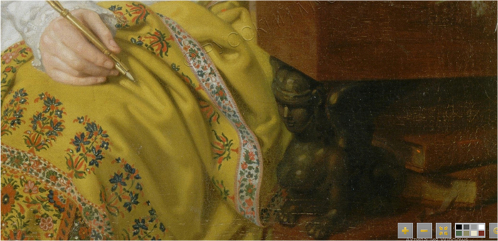 Рассматривая "огурцы" из цветочных мотивов на шали, углядела рядом подлокотник в виде сфинкса, явно намёк Боровиковского, автора портрета, на модную масонскую ложу "Умирающий сфинкс".