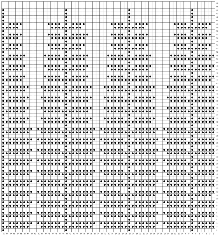 Это тунисское вязание, на концах палантина —жаккардовый узор, мой собственный, но с историческими корнями (схемы прилагаю ниже). Так как в тунисском вязании каждый ряд схемы провязывается дважды, узор на полотне вытянут в высоту по сравнению со схемой.