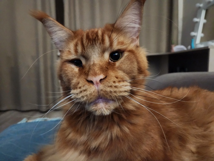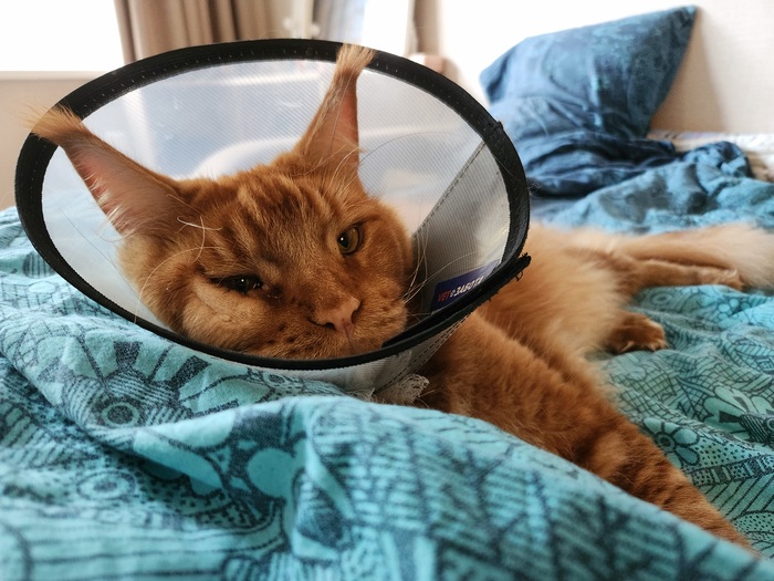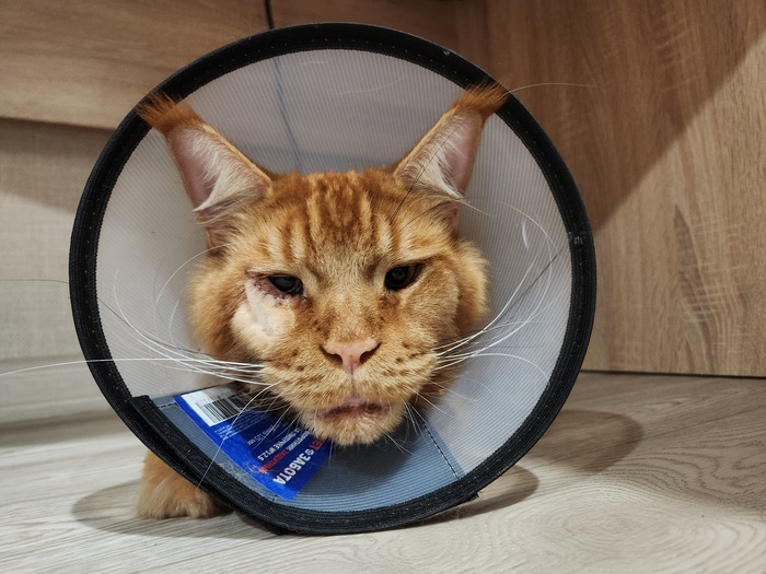 Заболел у нас мейн-кун, сначала щурил один глаз, мы не обращали внимания (что не есть хорошо с нашей стороны, признаю), потом и вовсе перестал открывать один глаз, который в последствии начал гониться. Мы с чего-то решили, что они подрались со второй кошкой и та заехала когтем ему в глаз. Как только пошло нагноение, то кота в охапку и в ветеринарку. Там сообщили, что у него типичная кунья проблема - заворот века и лечится исключительно хирургисческим путем. Кота жалко, но куда деваться. В максимально сжатые сроки проверили ему сердце, получили добро на операцию и повезли в клинику. Операция прошла быстро, но нам честно сказали, что ситуация может повториться и нужно быть у этому готовыми. Ну ладно. :(