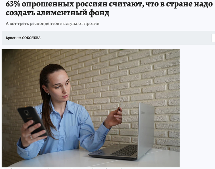 А вот версия "Комсомольской Правды": 63% опрошенных россиян считают, что в стране надо создать алиментный фонд. С правдой у "Комсомольской Правды" дела обстоят ненамного лучше, чем в политическом движении "За правду". Правда у них тоже только в названии и в кавычках. Вопрос: кого они опрашивали на 63% за? Одних только разведёнок и опрашивали? Так те всегда за, тем всегда всего не хватает. Очередной халяве за наш счёт они только рады. «Нужен, конечно, такой фонд! Не все мамы могут работать сразу после развода», - говорит участница опроса. (с) Ну кто б сомневался. Удивили шлюху минетом. Они не только после, они и до развода не больно-то рвутся работать. На работе ещё ни одна не сгорела. Не секрет, что многие "успешные" дамочки создают семьи именно в расчёте на будущие алименты. Жить за чужие деньги - это непреходящая мечта большинства наших современниц. Раньше таких называли аферистками. Теперь не называют. Но именно в интересах таких аферисток создаются подобные фонды. Честным людям в подобных фондах делать нечего, честные люди сами работают и зарабатывают.