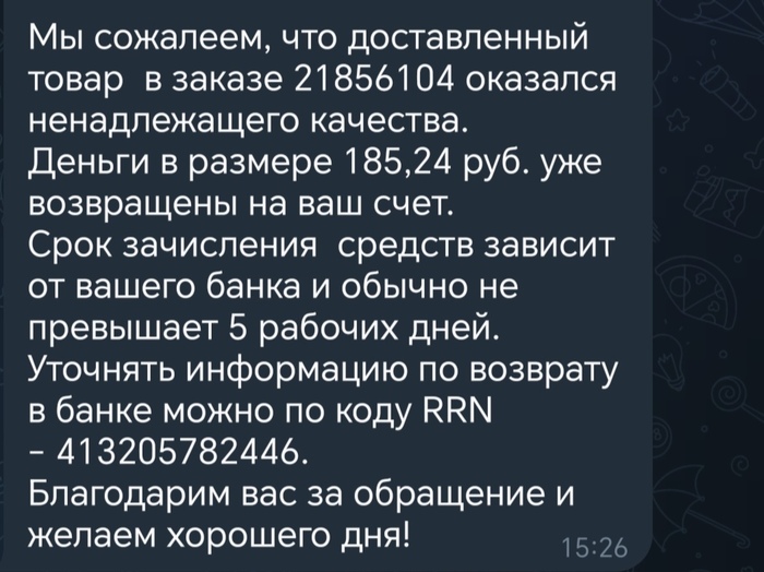 Ну и фееричный "возврат средств". (Деньги вернули чисто, за один кусок сыра) От души в душу, спасибо. Теперь буду ходить в магазин ножками.