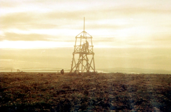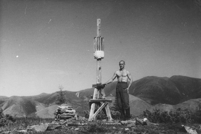 Почти все пункты на нашем участке были пирамидами, собранными из металлического 40мм уголка высотой около полутора метров. Ножки бетонировались в скалу на высоте 20-30см, настелен деревянный пол(из того же стланика). В инструментальном столике было отверстие, куда вставлялась труба с барабаном. Для аэрофотосъемки пункт маркировался двумя кусками марли, расстеленной на земле под прямым углом. Марлю прижимали камнями. Визирные барабаны обтягивали марлей, для того, чтобы видна была цель с других пунктов, если он проецировался на дальний хребет.