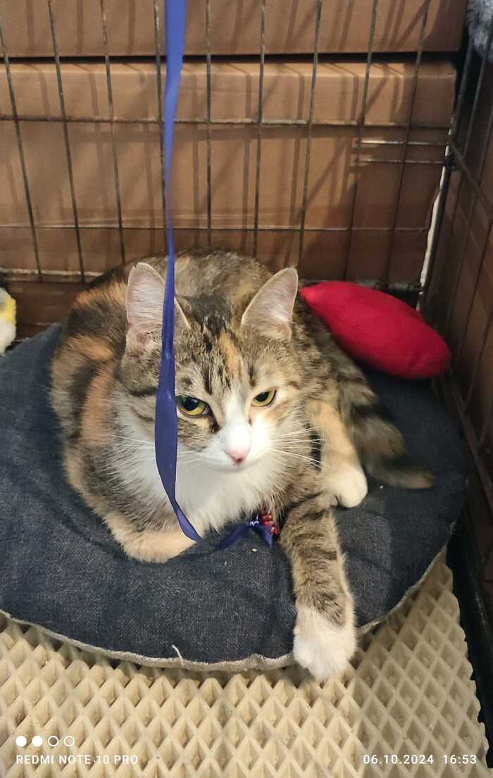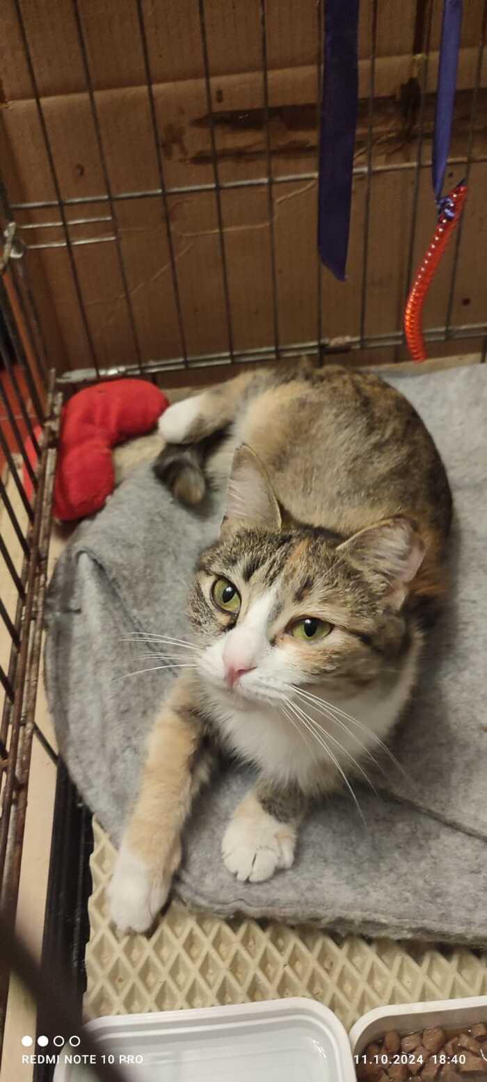 СПб, Невский район, ул. Тельмана 43 Найдена 30.09.2024 молодая кошечка, самка, окрас полосато- рыже-черно-белая, возраст примерно год. Трое суток сидела под машинами, грелась на солнышке, далеко от этого места не отходила. Поджимала правую заднюю лапу, передвигалась на трех. Была, отловлена, накормлена, рентген лапы показал сильный ушиб, без повреждений, сейчас лапа не беспокоит. После медосмотра была стерилизована. Кошка чистенькая, спокойная, ласковая, социализированная, тянется к людям. К лотку приучена, кушает сухой и влажный корм. Кошечка явно чья-то домашняя-потеряшка. Она или убежала или выпала из окна. Ищем бывших или новых хозяев