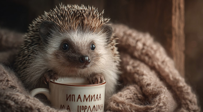Для эксперимента сформулируем простую, но наглядную задачу: изображение открытки, где ежик держит чашку горячего какао, и четко читается надпись «Теплый день».